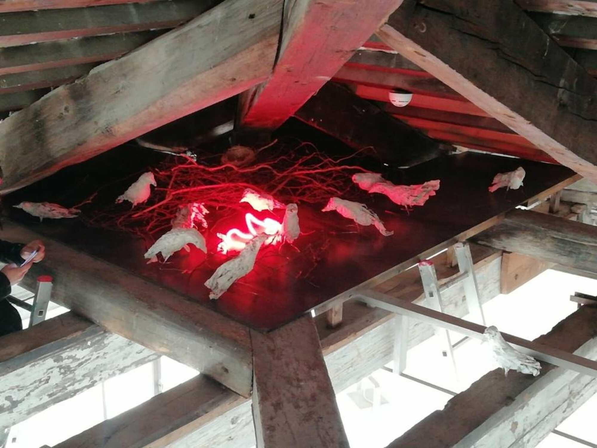Mixed - Media Installation consisting of Neon, Tree branches, Paper Clay, wire. The Installation is sited in the rafters of Palazzo Mora.