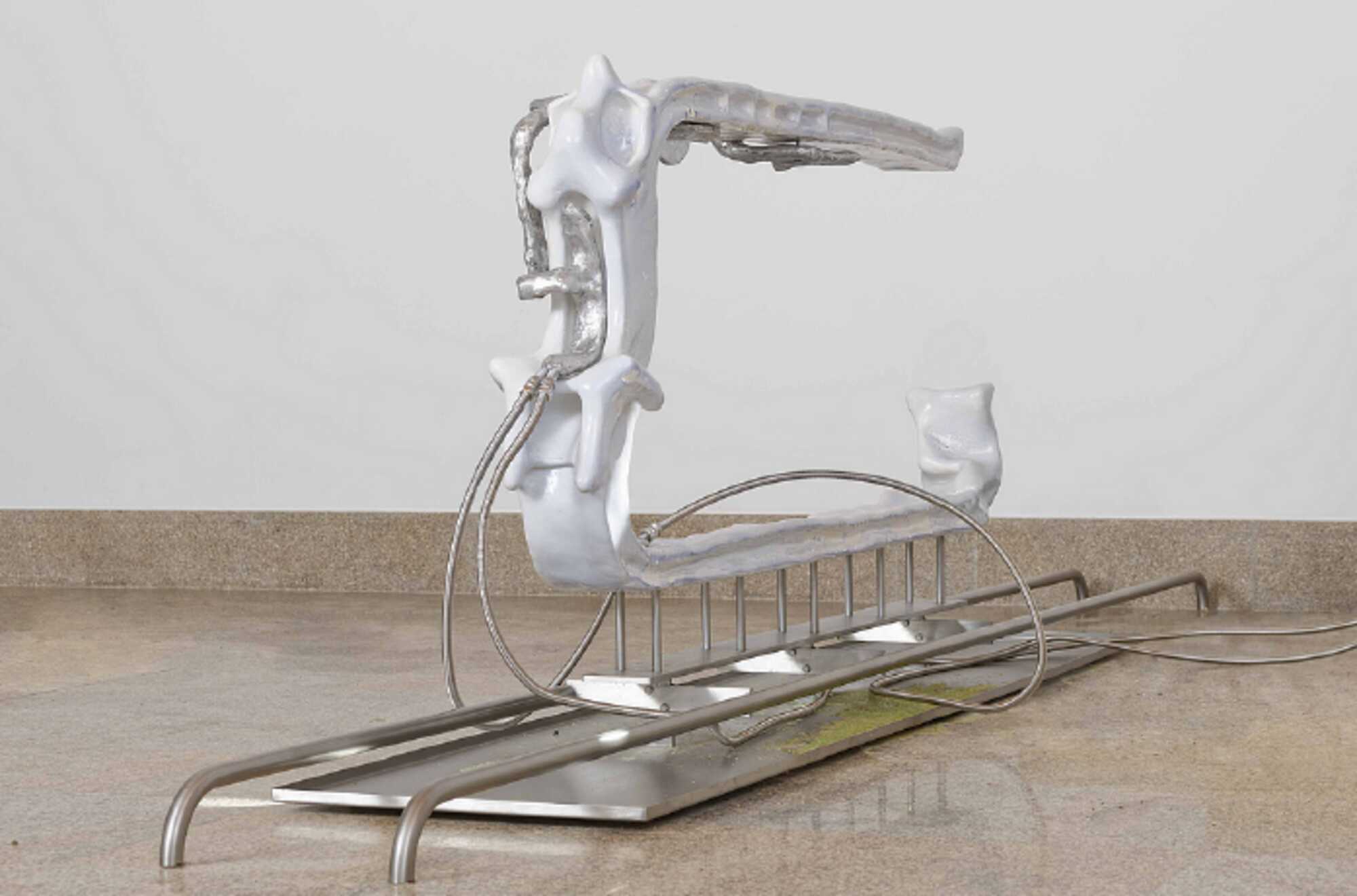 Picture: Isabelle Andriessen, Necrotic Core, 2021, ceramic, aluminum, iron(II) sulphate, stainless steel, water, cooler, pump, Photo: Aurélien Mole