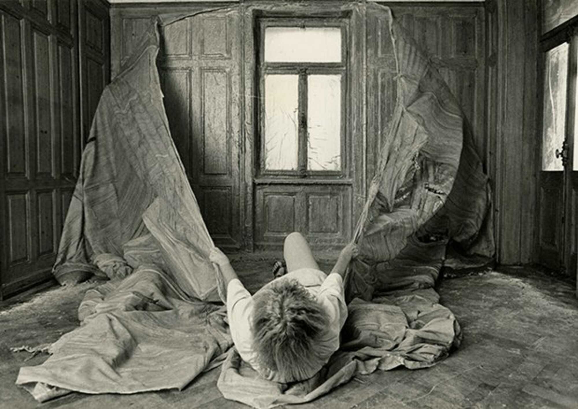 Bild: Heidi Bucher beim Häutungsprozess von Herrenzimmer, 1978, The Estate of Heidi Bucher, © Foto: Hans Peter Siffert