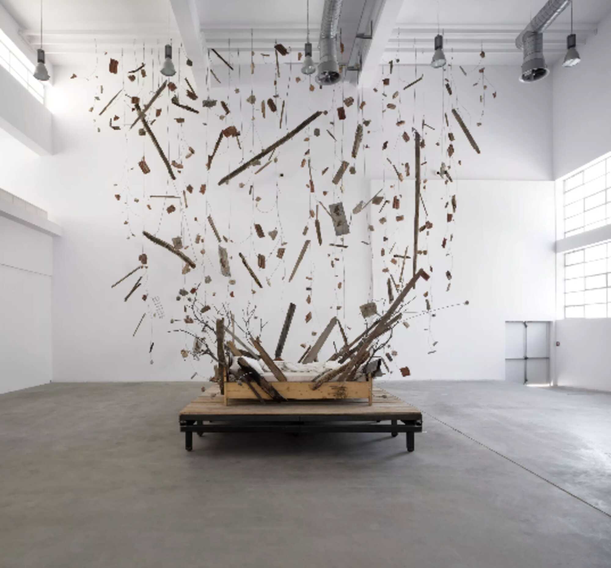 Picture: Dreaming on, fast asleep, your face came to my mind. When I opened my eyes, it was nowhere to be found. Bricks, wood, glass and metal from the former House of Culture in Runik, steel, clay, resin, textile, courtesy