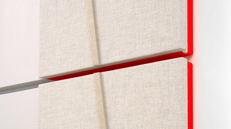 Classifiable as neither paintings nor sculptures, many of the works in the exhibition feature architectural felt and acoustic panels to create what Jones calls “active surfaces.” By absorbing sound, these materials affect the acoustic properties of their environments and invite participation in an embodied mode of perception.