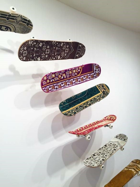 Picture: Mounir Fatmi, Maximum Sensation, 2016, skateboards, prayer rugs, approximately 90" H x 192" L x 12" D