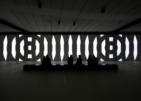 Bild: Carsten Nicolai, unidisplay, 2012, real-time projection, large-scale screen, mirror walls, bench with loudspeakers, dimensions variable, Exhibition Views, Museum für Modern Kunst Frankfurt am Main (MMK), Photos: Axel Schneider, courtesy Galerie EIGEN + ART Leipzig/Berlin and Pace Gallery, VG Bild-Kunst, Bonn 2021