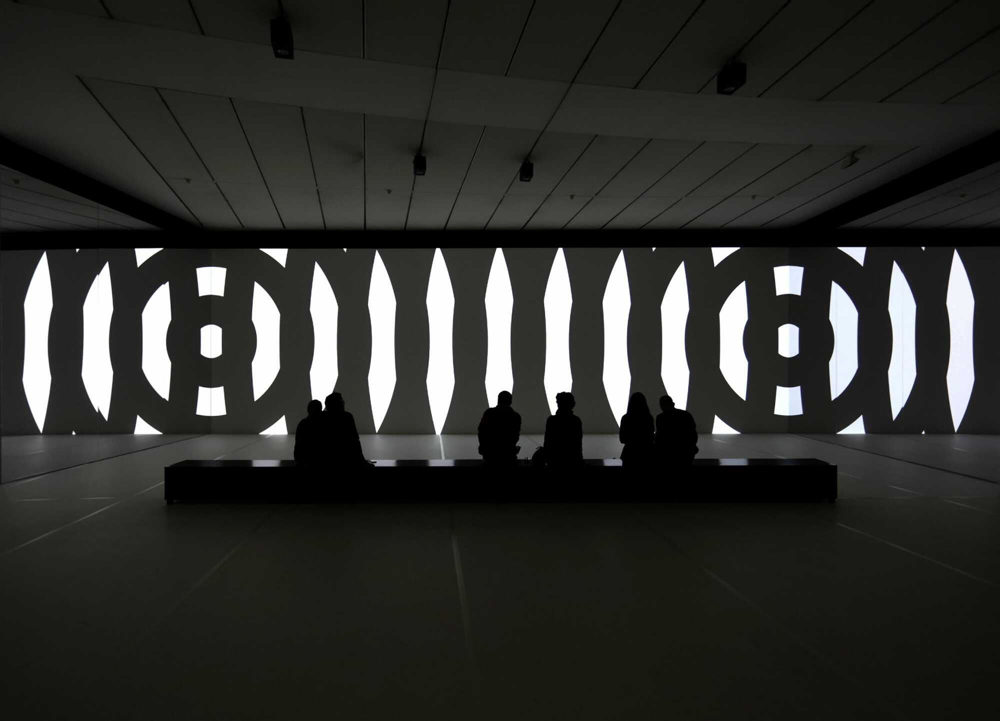 Bild: Carsten Nicolai, unidisplay, 2012, real-time projection, large-scale screen, mirror walls, bench with loudspeakers, dimensions variable, Exhibition Views, Museum für Modern Kunst Frankfurt am Main (MMK), Photos: Axel Schneider, courtesy Galerie EIGEN + ART Leipzig/Berlin and Pace Gallery, VG Bild-Kunst, Bonn 2021