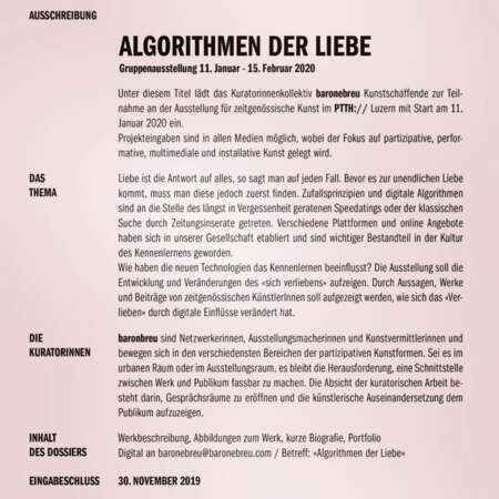 Werkbeschreibung, Abbildungen zum Werk, kurze Biografie, Portfolio Digital an baronebreu@baronebreu.com / Betreff: «Algorithmen der Liebe»
