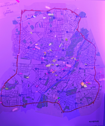 The result of the evening: good mood, manifold conversations, a lot of art, a lot of creativity, lively exchange, but above all a colourfully filled Artmap - the guests named about 90 art locations as their favourites! Among these are, for example, Fritz Koenig's GroĂźe Biga in front of the Alte Pinakothek, a wood carving in an old tree in Westpark, the wild boar in front of the fishing and hunting museum, the Bamberg Villa, the cowboy sculpture in Petuelpark or the Olympic Park.