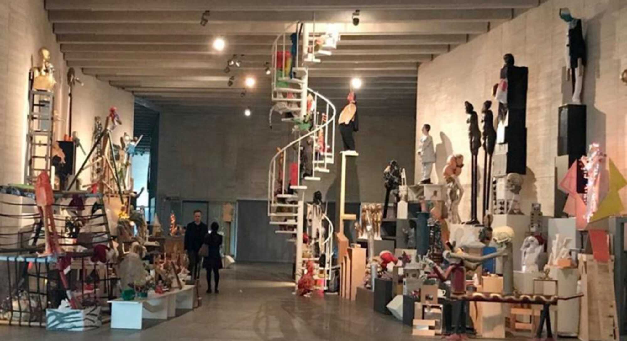 Taking on a different presentation each time it is exhibited, the installation at MUSAC is a reimagined version of the Theater for Memory. An organized chaos of furniture, exhibition elements and props form tiers on opposing walls of the space where the sculptures, lifted onto pedestals in an attempt to reach as high above, are accumulated. In the center, a spiral staircase goes up to the ceiling, from which several other sculptures climb down in their own silent procession. The spectator passes through as if in the central nave of a church, with the statues of saints looking down in keen observation on their subject, the observer, observed: