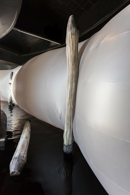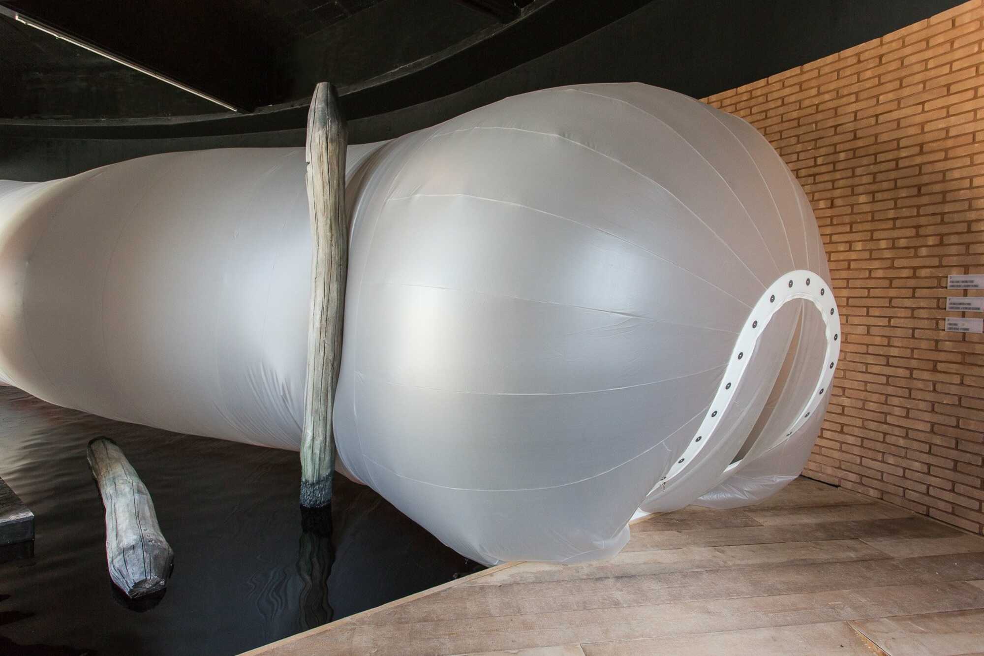 Molte volte il padiglione cittadino si è rivelato parte poco interessante dell’esposizione nelle precedenti edizioni e pertanto è stata una piacevole sorpresa per l’intuizione quasi profetica di quest’anno. Protetto da un asettico tunnel gonfiabile trasparente puntellato dalle briccole (i tipici pali veneziani usati per le fondamenta e per ormeggiare le imbarcazioni) il visitatore era chiamato a percorrere scalzo un percorso acquatico. La gomma e l’aspetto soffice del tunnel si contrapponeva in maniera riuscita agli elementi in marmo fornendo complessivamente un’atmosfera spettrale all’installazione.