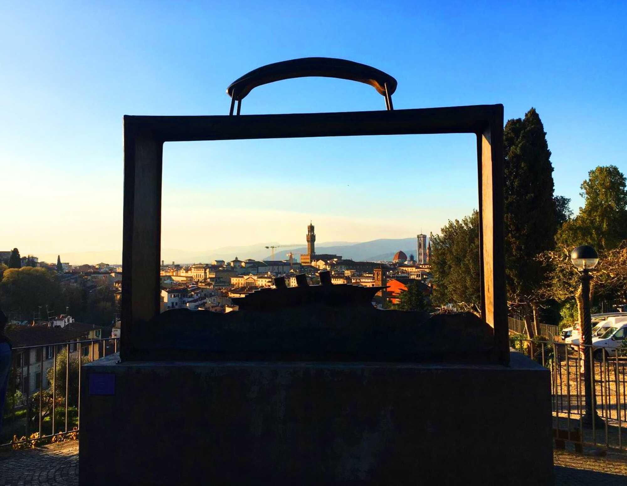 We leave Michelangelo’s David and the square named after him and continue on to the Rose garden only a few minutes walk away. Here we find about 350 different types of roses and a variety of other plants, as well as 12 beautiful sculptures by the artist Jean-Michel Folon (1934 - 2005). At the entrance to the garden we find Partir (leave). This sculpture depicts Folon's nostalgia for Italy, a country with which he fell in love during a journey at a very young age. The sculpture is the outline of a suitcase, and inside, a ship riding the waves. The suitcase frames the city, lyrically inviting you to take Florence home with you.