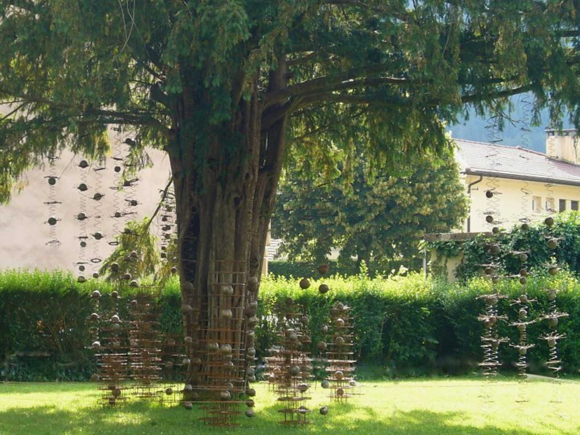 This atmospheric photo shows the installation "Le Nid des Djins" by artist Eva Ducret at night - completely immersed in red light. In daylight you can see the complexity of the work: Like a universe of its own, the work "grows" around a tree making it it part of the Installation.