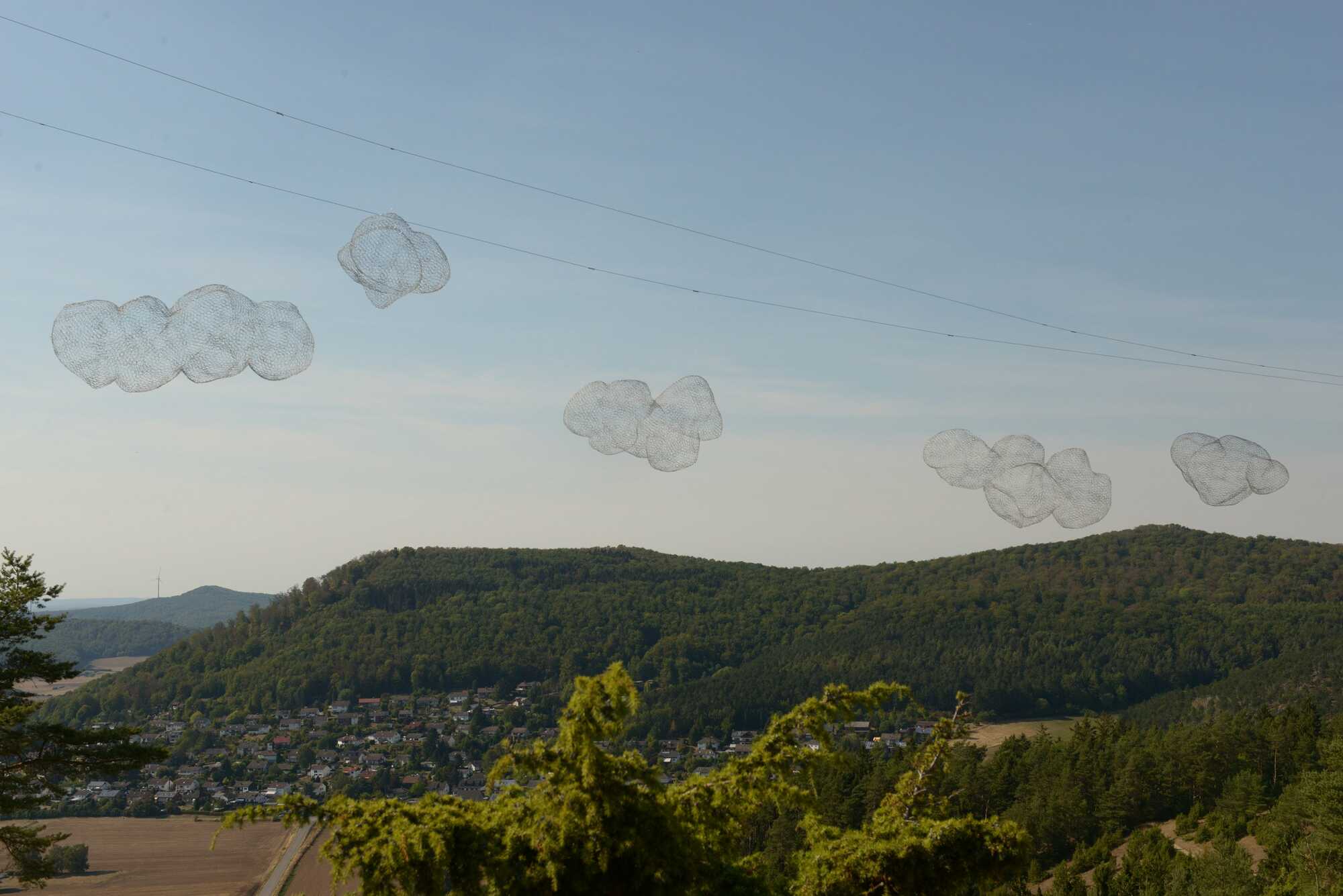 The installation "My Cloud" - a data cloud of acrylic tiles by Kirsten Sauer/KISA, winner of the "bewegten winds 2016" prize - was located at the intersection between the Alpenpfad and higher Dörnberg and formed a cloud from several individual tiles.