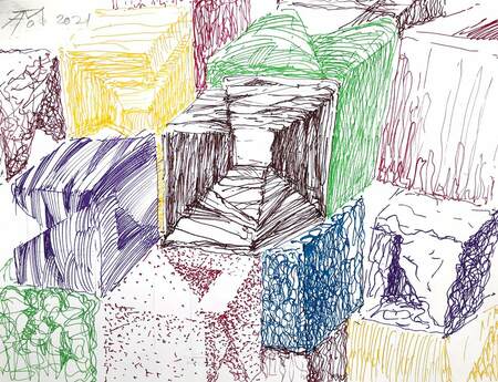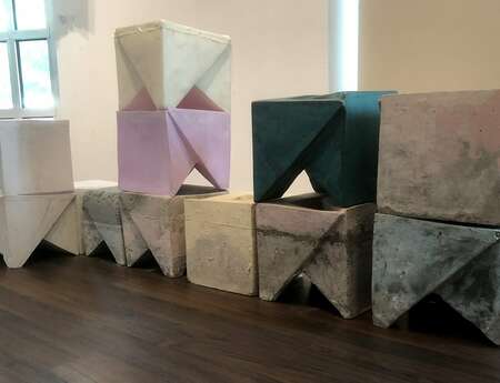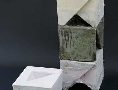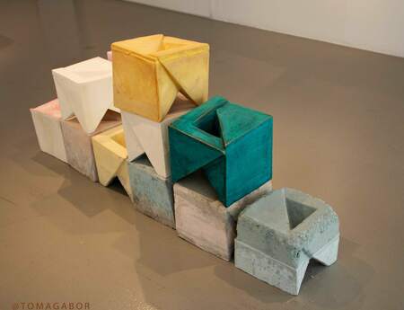 In his new works, the cuboid-like shape is a modified Platonic volume, becomes a module in an architectural structure or a setting that can be hidden or visible. Inspired by the traces of old buildings one might find in an ancient place, the installation calls to mind how these crumbling individual components now only serve as silent witnesses. However, at one time may have been the key element of a wall, or ceiling, etc. Regardless of their prior functionality, the aesthetic potential overrides the previous story.