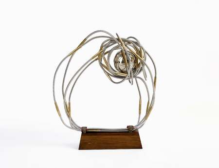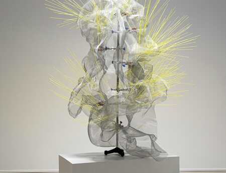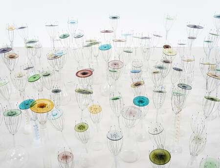 Cate Wind creates sculptures and installations that reveal correlations between modern knowledge and ancient systems of belief. Trained in the craftsmanship of glass, traditional painting, and visual communication, Wind assembles refined materials such as metal, glass, or resin with discarded found objects including gearwheels, vintage herbariums, or religious textiles. Her work merges the energy contained within these materials and objects with her own personal experiences. Where her art may not fit into any one particular genre, Cate Wind boldly creates her own. On a more visual aspect Energy is materialised through light and colour and reflection, which play a central role in her practice. These associations create a multi-layered, vivid image - as in life, there is not always one perspective. More precisely for her paintings she uses glass shards glide over oil paint - revealing several layers which can be seen as a unique way of track reading.