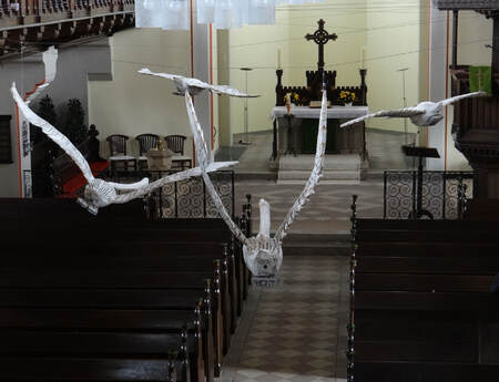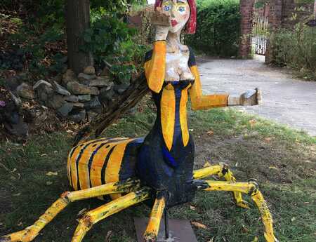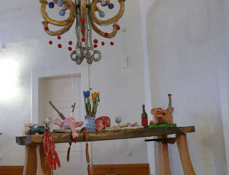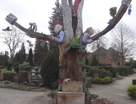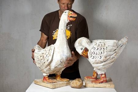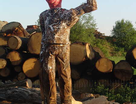 Seine Skulpturen, die er aus verschiedensten Holzarten mit der Kettensäge erschafft, sind Ausdruck wieder gewonnener Kindlichkeit und pointieren oft die sensiblen Seiten unseres Daseins: Peinlichkeit, Empfindsamkeit, Angst.“