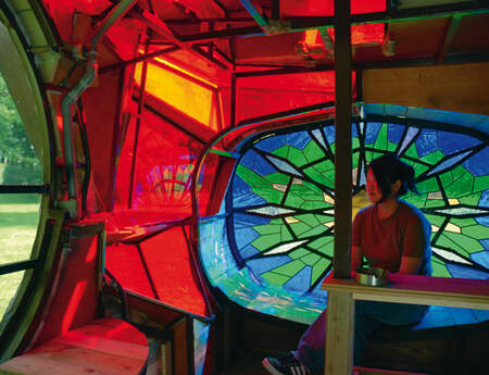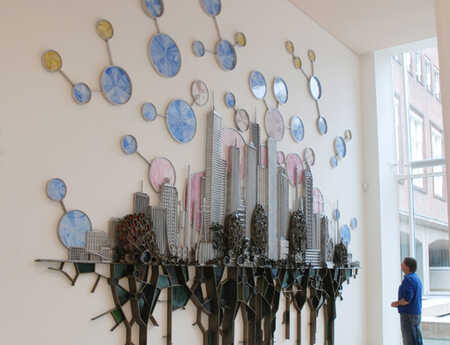 Over the past few years, Voerman engaged in his work more directly to the architecture and ideas of Modernism in relation to our present time. By this, he often refers to the architecture Le Corbusier, Frank Lloyd Wright, Rietveld , Mies van der Rohe. Although modernism in many ways seems to have failed, Voerman thinks that many of her ideas are still relevant in present times. Grand ideas and views as imagined by the modernists seem nowadays completely gone. The fragmented clear view of the modernists sometimes seems almost literally represented by the large amounts of small colored windows in Voerman's installations.