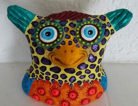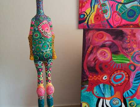 Pia uses Bold colours freely and surreally. The figures, if people, animals or mythical creatures are strong and life-affirming. Inspired by the formal esthetiks of the totempoles in her native country Canada. They are a reminder of our responsibility to all life on this planet.