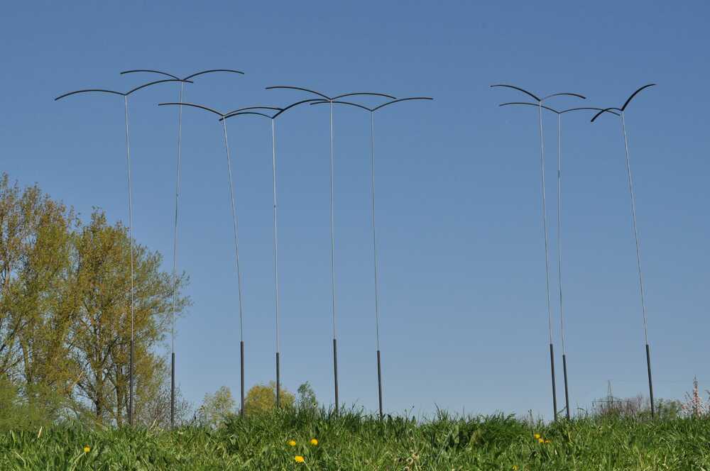 Installation aus 4 Objekten mit je 3 Vögeln