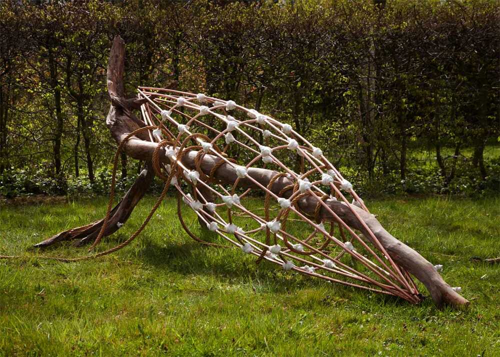 Fallen, the work "Fallen" tries to involve the viewer into the destiny of nature. Originally the installation stands right up, but is presented as if it's fallen over. The endings of the branch that seem to escape the cage are covered in bandages, so are the joints of the cage. The blood washes away over time, but the wounds remain. Who's (playing) the victim?