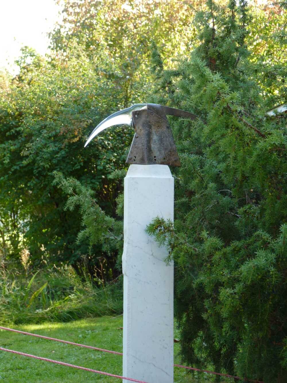 - - Ein Begleiter - - Stahlblech, Acrylglas, Blattgold, auf Marmorstele; Parkanlage in Ansbach