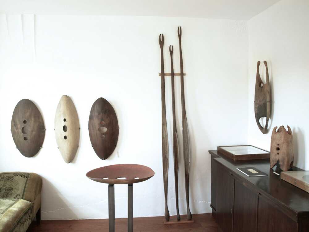 "Artefakte" Die aus verschiedenen Hölzern gefertigten Objekte legen vertraute prähistorische oder ethnologische Zusammenhänge nahe. Näher betrachtet irritieren jedoch diese „Artefakte“, entziehen sich einer Zuordnung oder Bestimmung.