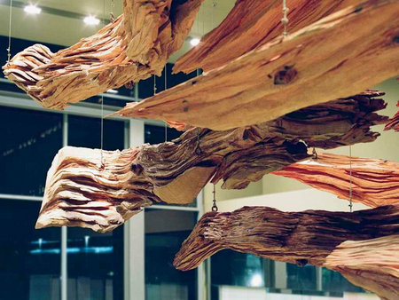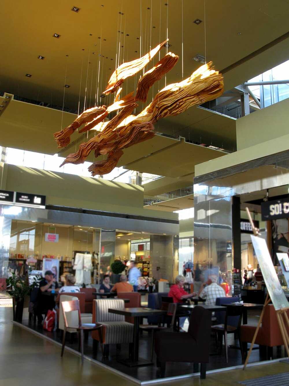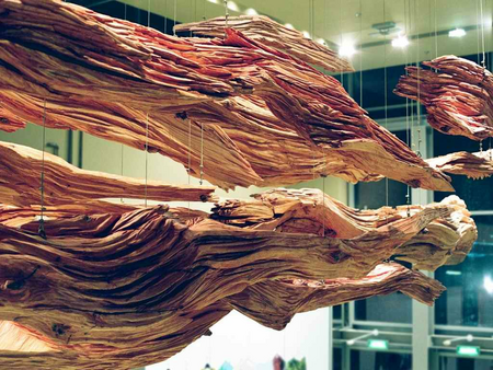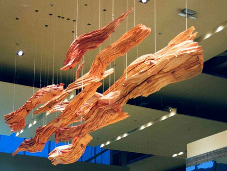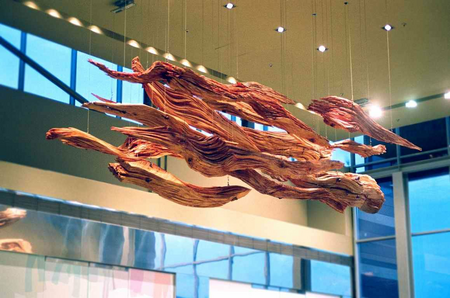 The sculpture is a poetic vision opposed to a colorful commercial shopping mall. It is suspended on the ceiling. The sculptural form placed above seem to correspond visually to the world below. However, they do not belong to this busy world of commerce, but rather counterpart it.