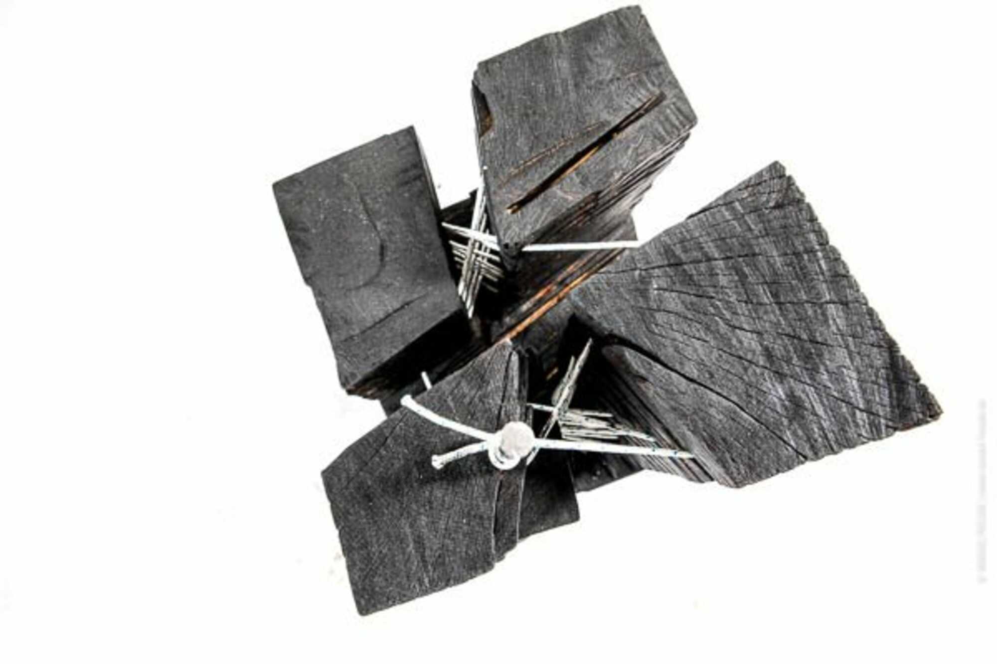 Holz, gesägt, gefeuert, Metallstäbe, Schnur eingeflochten