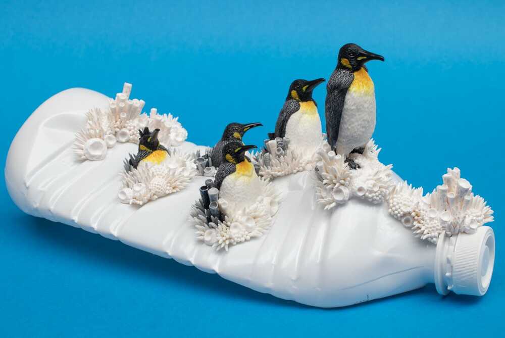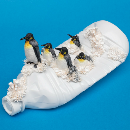 Five penguins emerging from a coral like growth are navigating on a white plastic bottle.