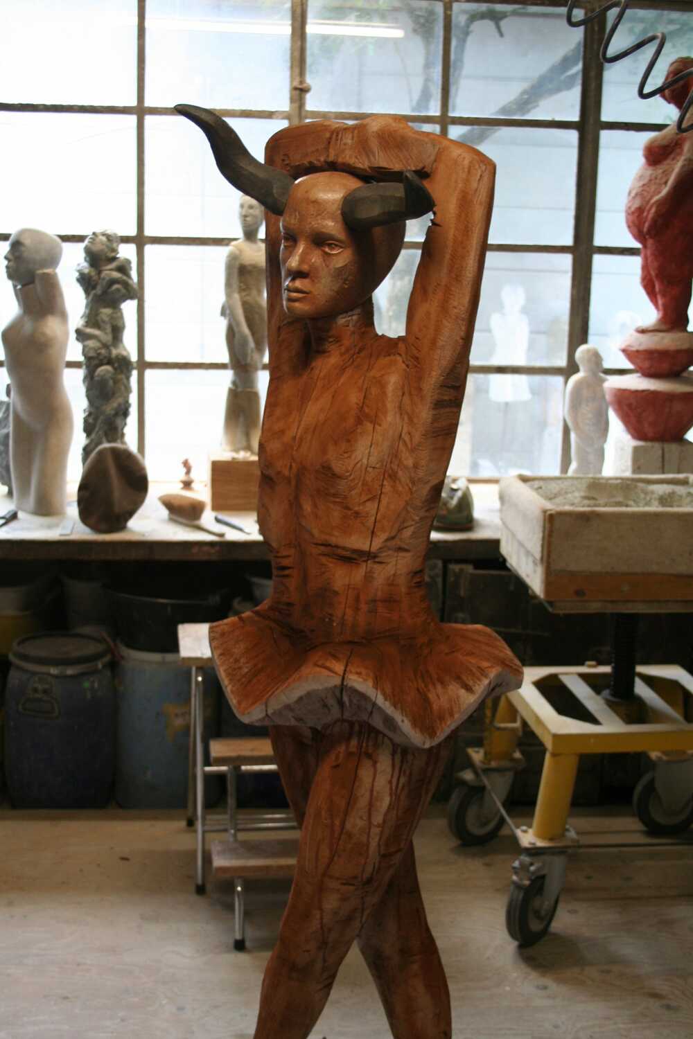 Der Tanz entstand aufgrund eines Bildhauersymposium. Zu Hause habe ich die Arbeit weiterentwickelt. Es entstand ein Kopf aus Kalkstein mit Hörnern aus Eichenholz.