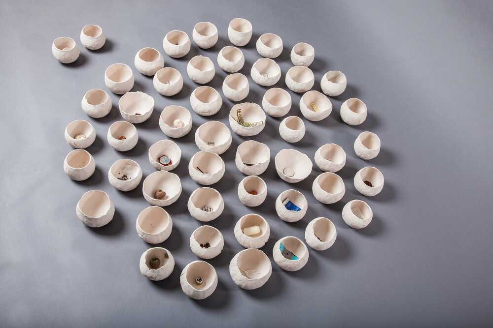 Installation zum Thema ZEIT - Zeit erinnern, festhalten, koservieren. Über einen Zeitraum von 52 Wochen - 1 ganzes Jahr lang - wurde jede Woche aus 250 g Ton eine Schale in pinchtechnik gestaltet und etwas für diese Woche "erinnerungswürdiges" eingelegt