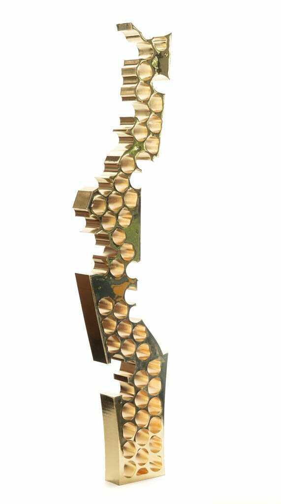 First a drawing on paper and next on screen with 3D Technique. Realised in factory Materialise (Belgium. Louvain) and finally covered in metal.
