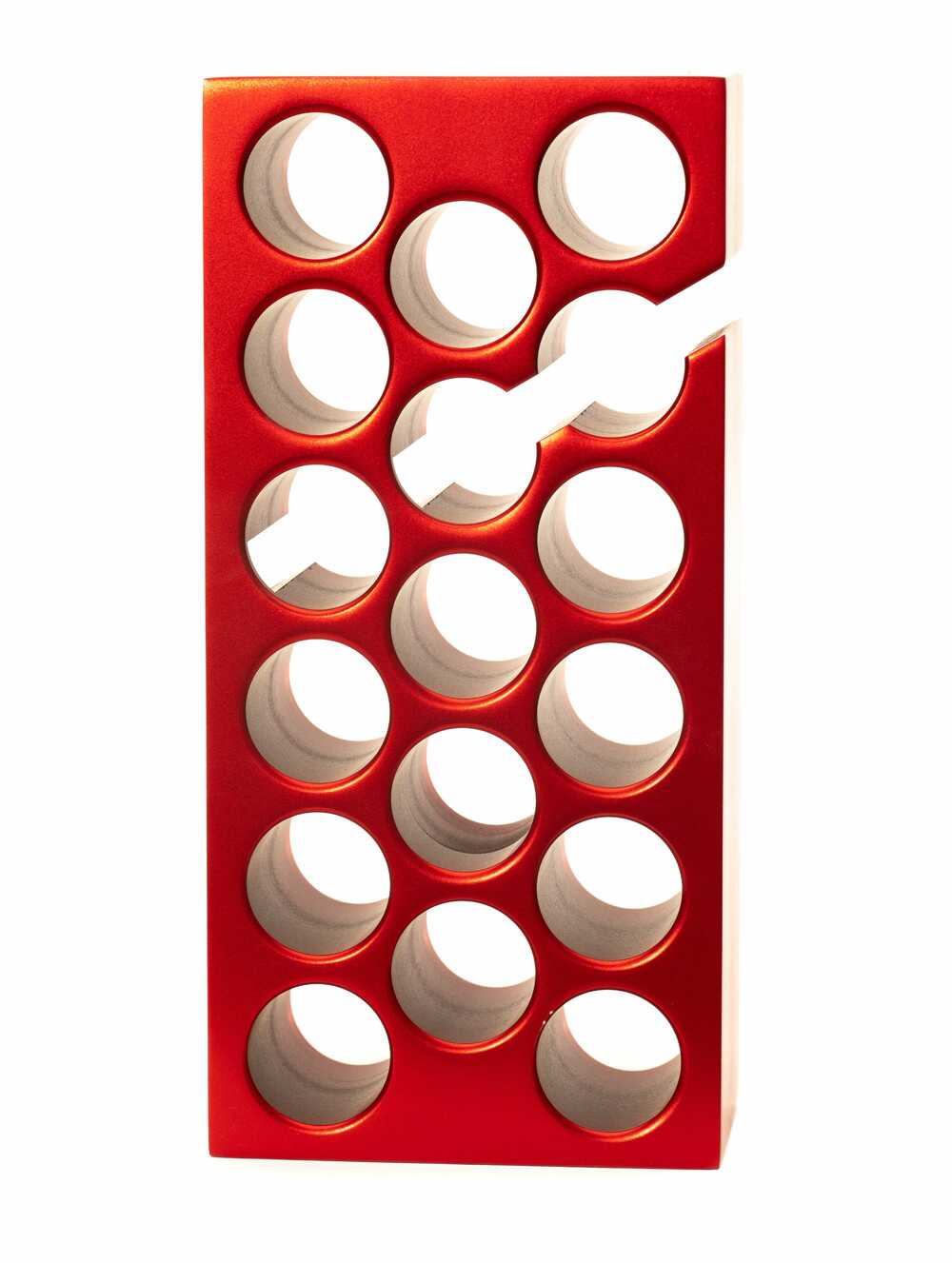 A red and perforated brick that suggests fragility while the brick is perfectly shaped.