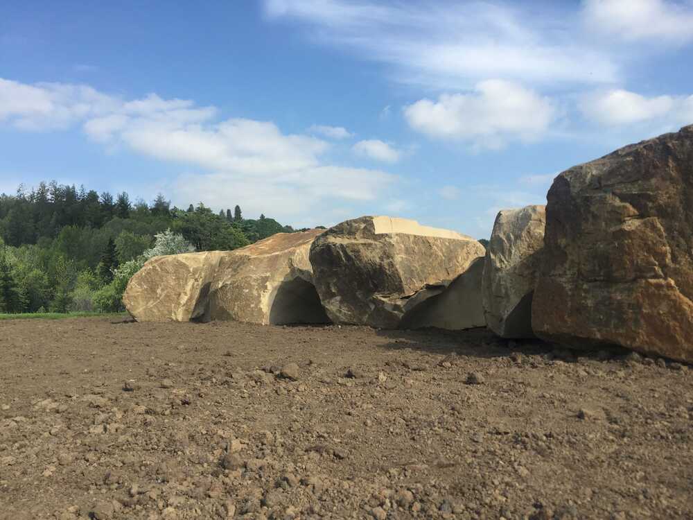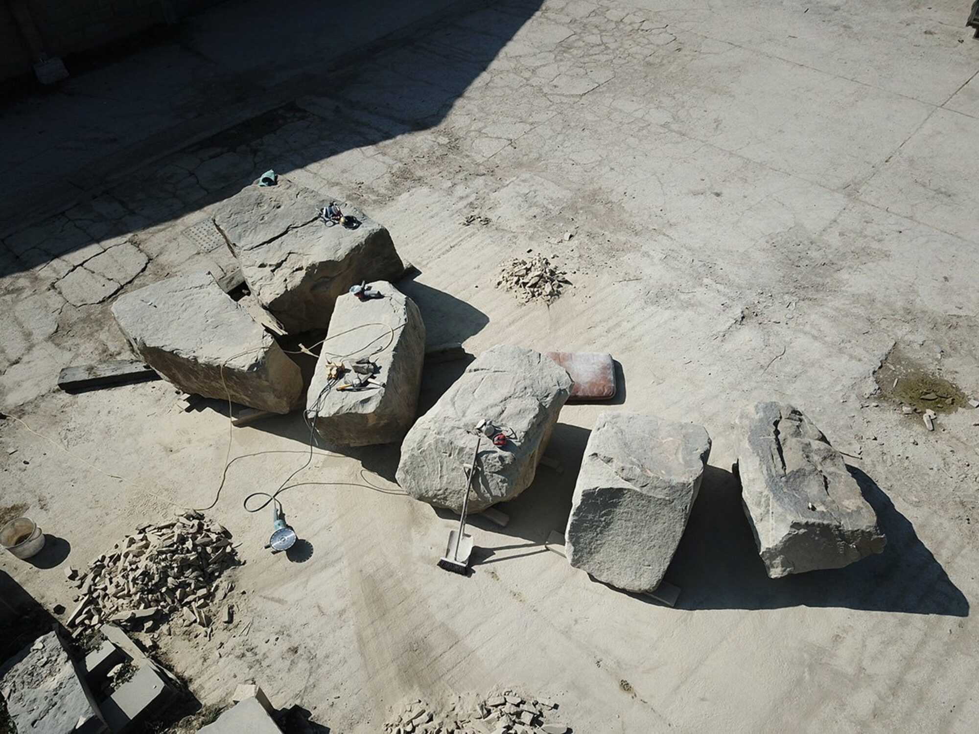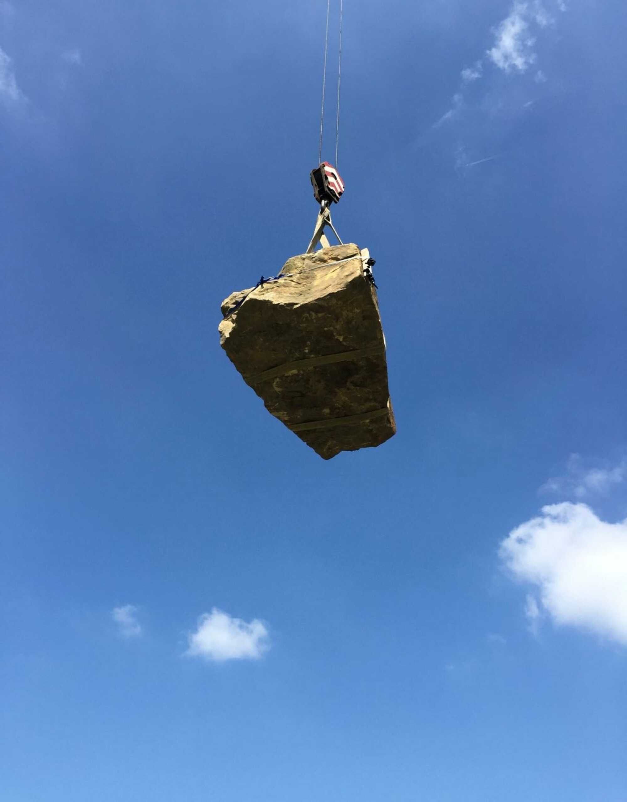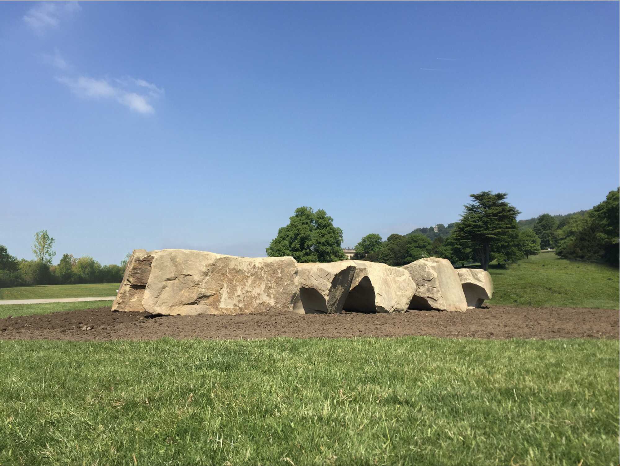 The sculpture, which is named Holocene after the current geological epoch, takes the form of a series of large sandstone blocks, which come from the Chatsworth estate. Like a large sundial, the blocks cast a complex pattern of shadows at different times of day, meaning that the work repays spending time with and revisiting. Some of the blocks also have carved into them, in deep relief, the outline of the shadows that will be falling on them at a precise moment of time: this has been worked out exactly using computer modelling.