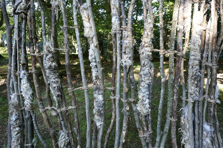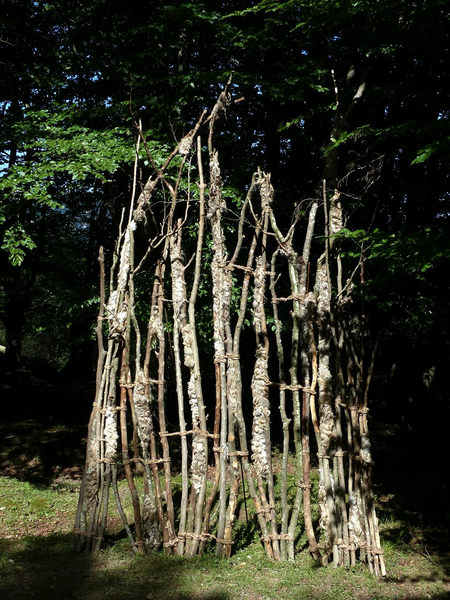 a site specific work done at the Azken Muga summer arts festival in the Basque Country, northern Spain in July, 2017. Composed of tree branches, sheared wool and hemp cord.