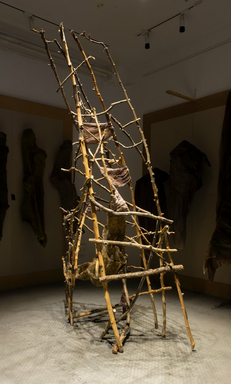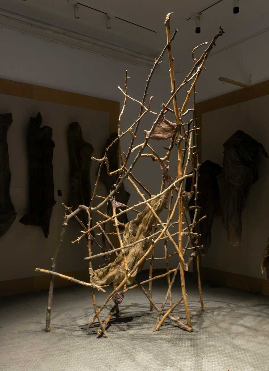 Free standing work made from tree branches, tarlatan gauze with light internal structure and color.