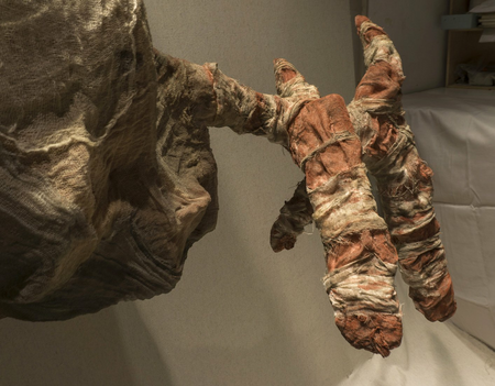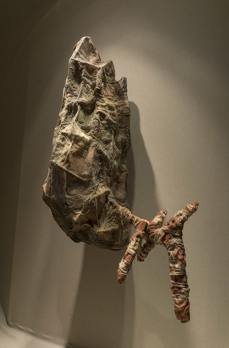 Wall-mounted work made from tarlatan gauze, light internal structure, wood, color.