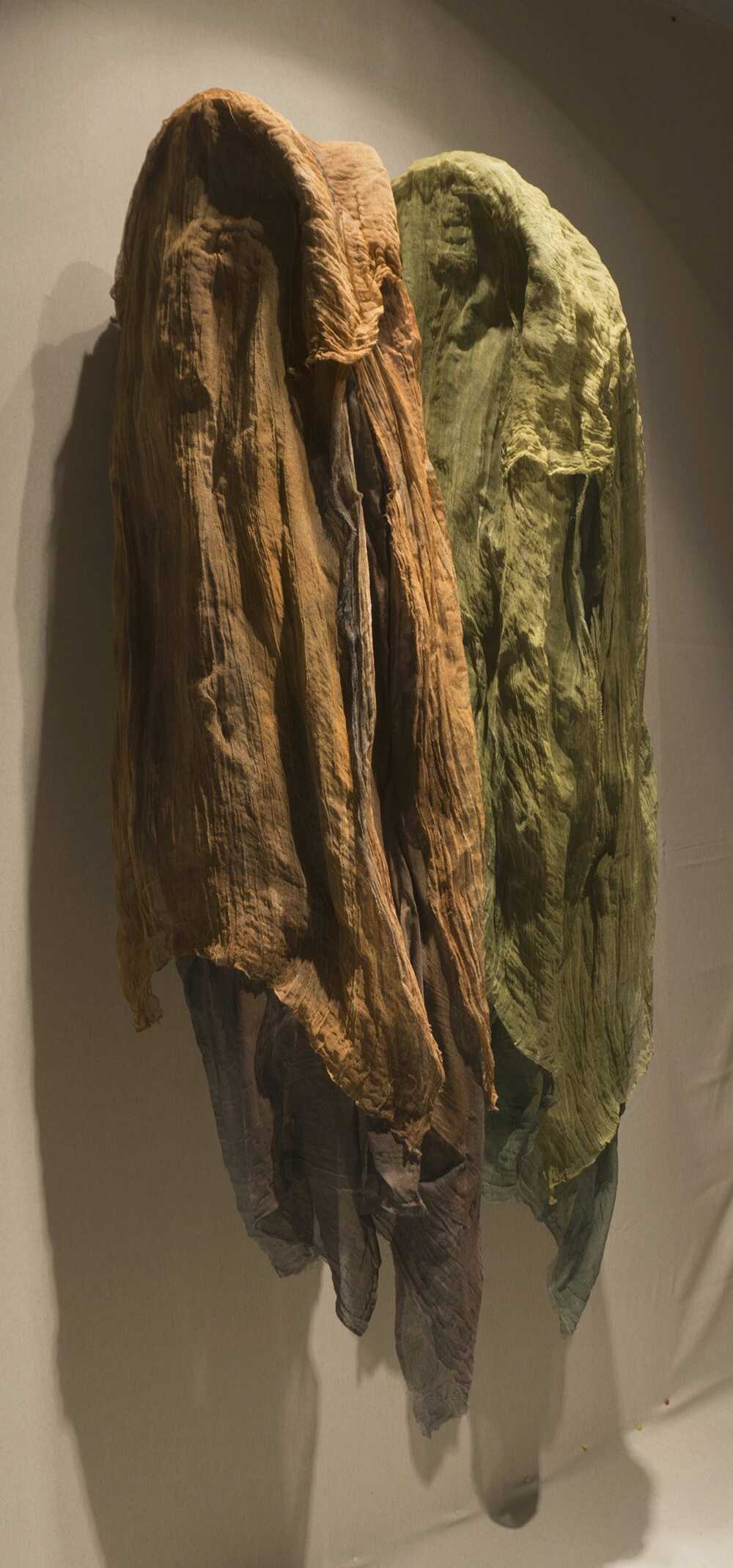 Wall-hung work made of tarlatan gauze, light internal structure, color.