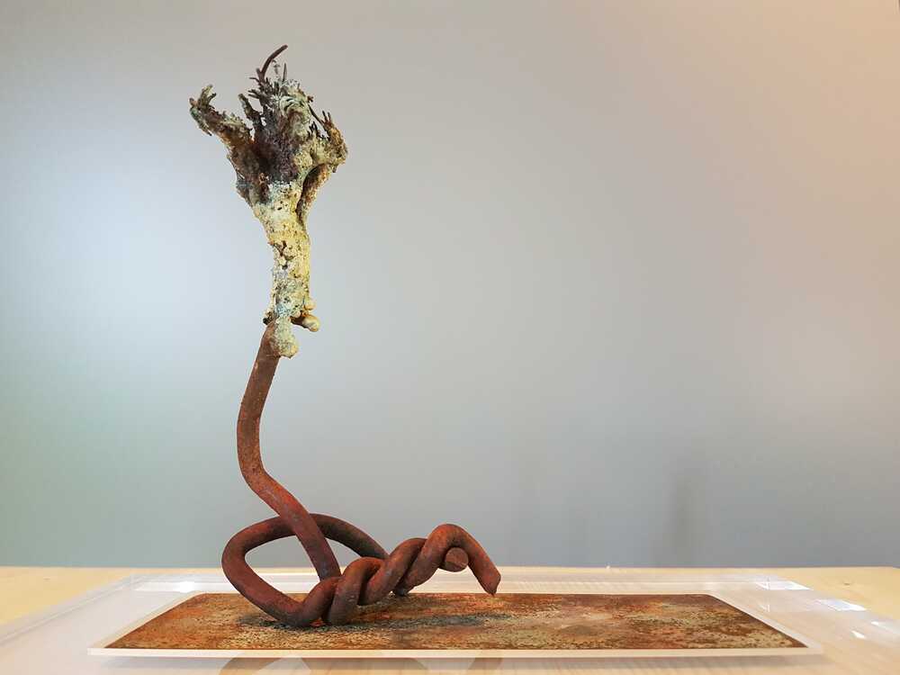 Bronze, patiniert auf rostigem Stahl und Plexiglas