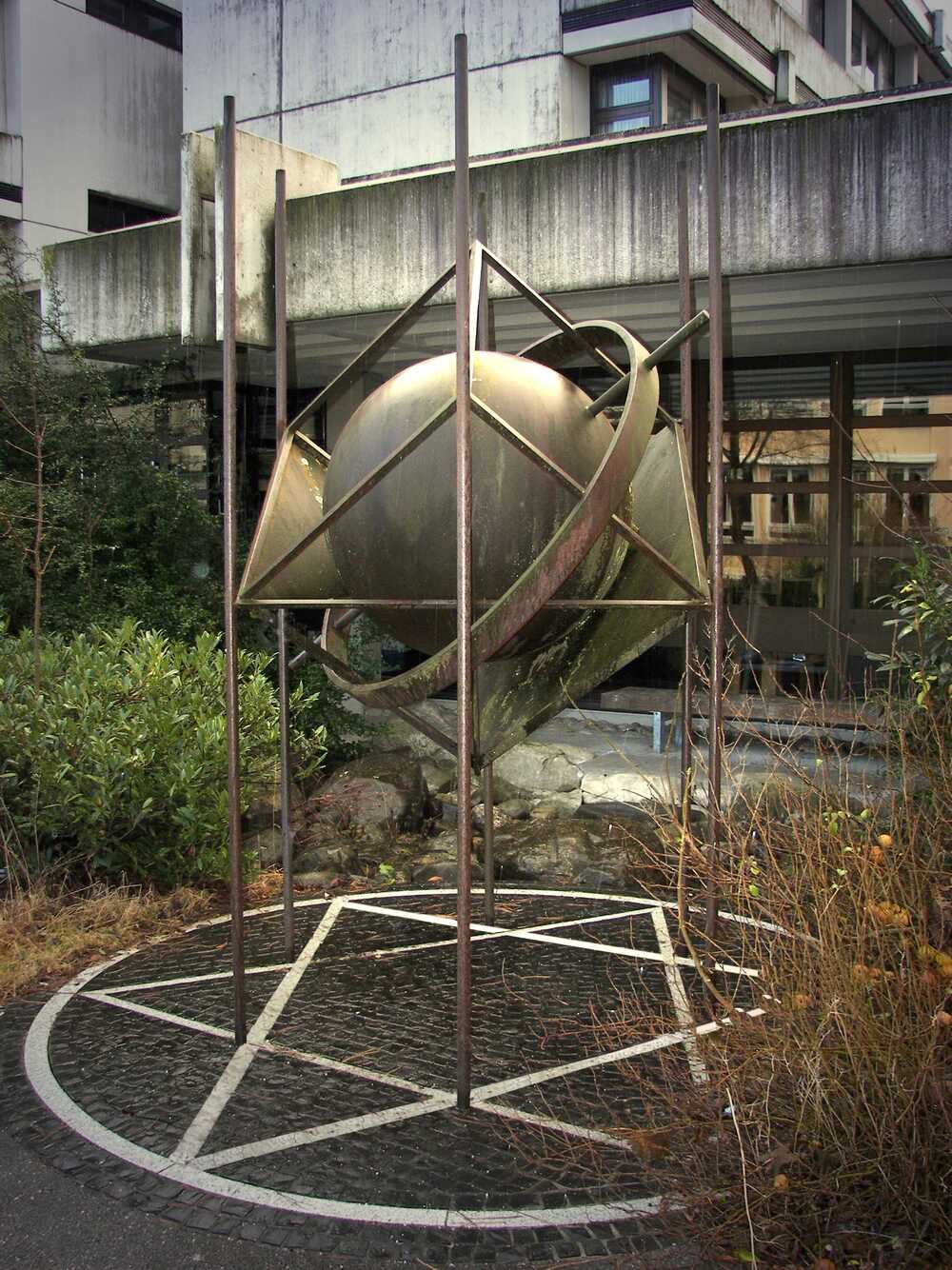 Zu sehen sind alle 4 Dimensionen: Linie,Fläche, Körper und nur symbolisch Bewegung/Zeit durch die Achse, die durch die Kugel geht. Der Kubus hat eine Kantenlänge von einem Meter, wie auch die Kugel 1m Durchmesser hat.Durch den auf die Spitze gestellten Würfel zeichnet sich durch die hinweisenden Rundstangen ein Sechseck ab. Die Bodenzeichnung besteht aus einem Kreis mit dem Radius von 1,414 m, das ist die Diagonale vom 1m Quadrat. Den Radius auf den Kreisumfang übertragen, ergeben sechs Teile. Diese miteinander verbunden, ergeben in der Projektion den auf der Spitze stehenden Würfel.