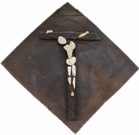 Ein alter verrosteter Kanaldeckel galt als Inspiration für dieses Werk. Mit gefundenen Steinen vom Meer ist dieser Gekreuzigte entstanden.