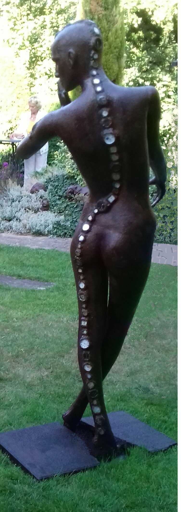 Grundlage: Kunststoff, mit Eisen und Säuren überzogen, verrostet, nicht mehr funktionsfähige Armbanduhren auf der Rückseite eingearbeitet, auf der Vorderseite Uhrenzeiger ohne Ziffern, Ziffern ohne Zeiger. Die Dame ist dem Zeitdiktat entkommen, keine der Uhren, die sie "ausschwitzt" kann und muss ihr noch die Zeit anzeigen.