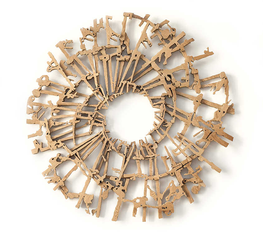 Im Spannungsfeld zwischen Narration und Skulptur, Bewegung und Zustand, Zeitfluss und Momentaufnahme vereint die Skulptur mutatis mutandis beides: Zentrifugal- und konzentrische Kräfte sind hier dauerhaft in Eichenholz gebunden. Auf übereinander liegenden Achsen drehen mit- und gegeneinander kreisende Wirbel. Dabei zersplittern sie in zahllose Segmente, die nur gemeinsam ein Gesamtbild ergeben. mutatis mutandis versinnbildlicht gleichsam Kosmos und individuelles Schicksal – unausweichliche Veränderung, im Augenblick verharrend.