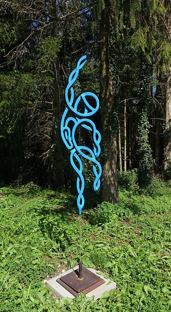 Eschenholz, Ă–lfarbe, Federstahlstange, Eisensockel