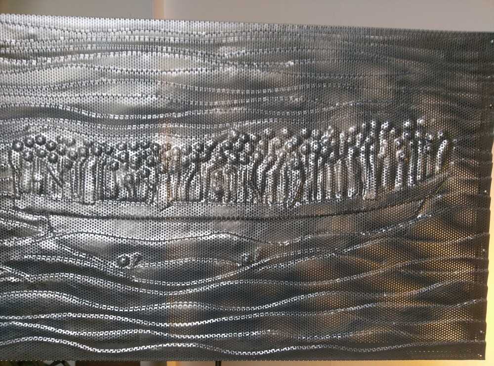 Ein Flüchlingsboot ist in Lochblech getrieben mit Tagesansicht(Vorderseite) und Nachtansicht (Rückseite).