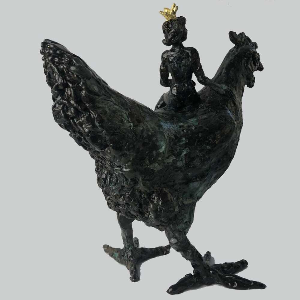 Magical realism, This queen riding her cockerel. Inspired by an eminent painter, who loves her chickens.