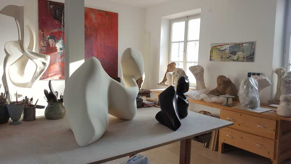 Ein Blick in die Werkstatt. Im Vordergrund "Bewegung" in zwei Größen