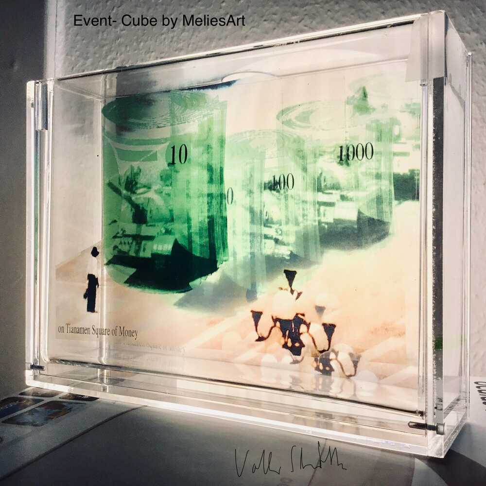 Acyrlglas- Box mit zwei Folien. Mann vor Ă¼berdimensionalen Geldschein- Rollen, durch die Panzer schimmern
