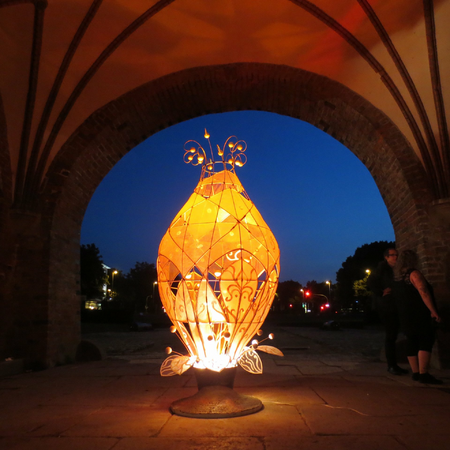 temporäre Installation, abends beleuchtet, Stadtort: im Torbogen des Holstentores, Auftraggeber: Lübecker Museen anläßlich der Aktion "verborgene Paradiese"