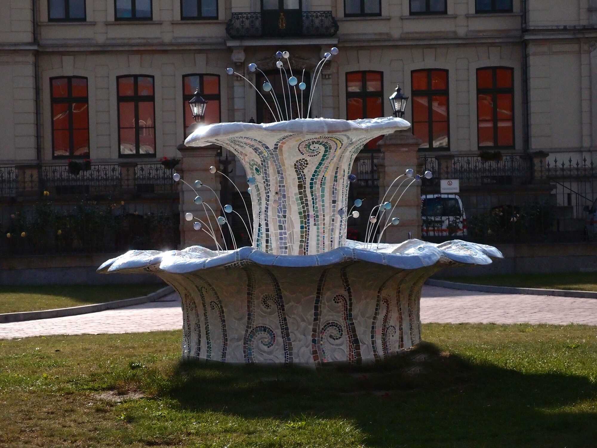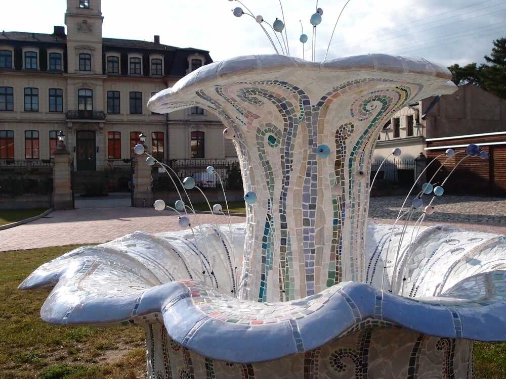 Grosse Mosaikskulptur, handgeformter Stahlbetonkörper vollständig mit Keramikmosaik und Porzellan besetzt. Standort: Schloß Schönefeld Leipzig
