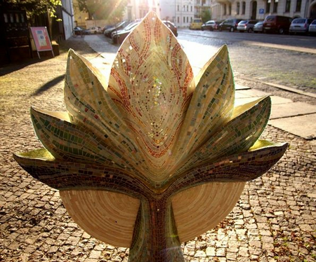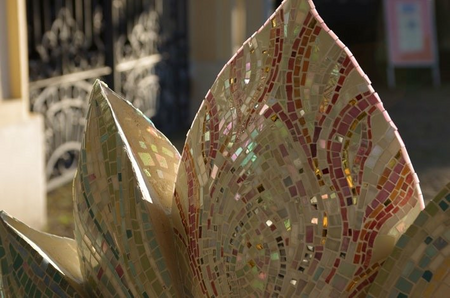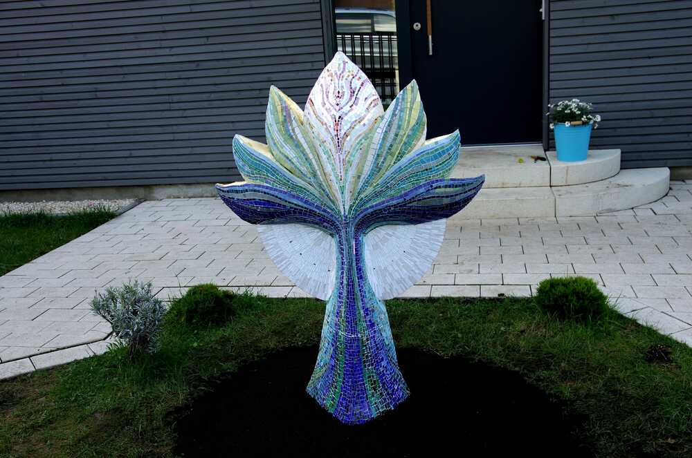 Mosaikskulptur aus Terrakotta mit Keramik- und Glasmosaik besetzt, teilweise vergoldet, Privatauftrag