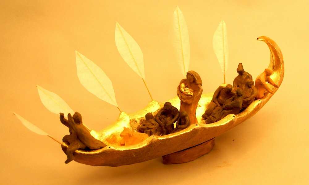 Diese kleine Plastik entstand auf einem Keramiksymposium zu einer Zeit, als viele Flüchtlinge im Mittelmeer ertranken. Ich wollte diesen schrecklichen Ereignissen ein positiven Bild der Überfahrt entgegensetzen. Die Überfahrt - das verlassen der einen Welt - um in einer anderen anzukommen ist ein starkes mystisches Urbild.